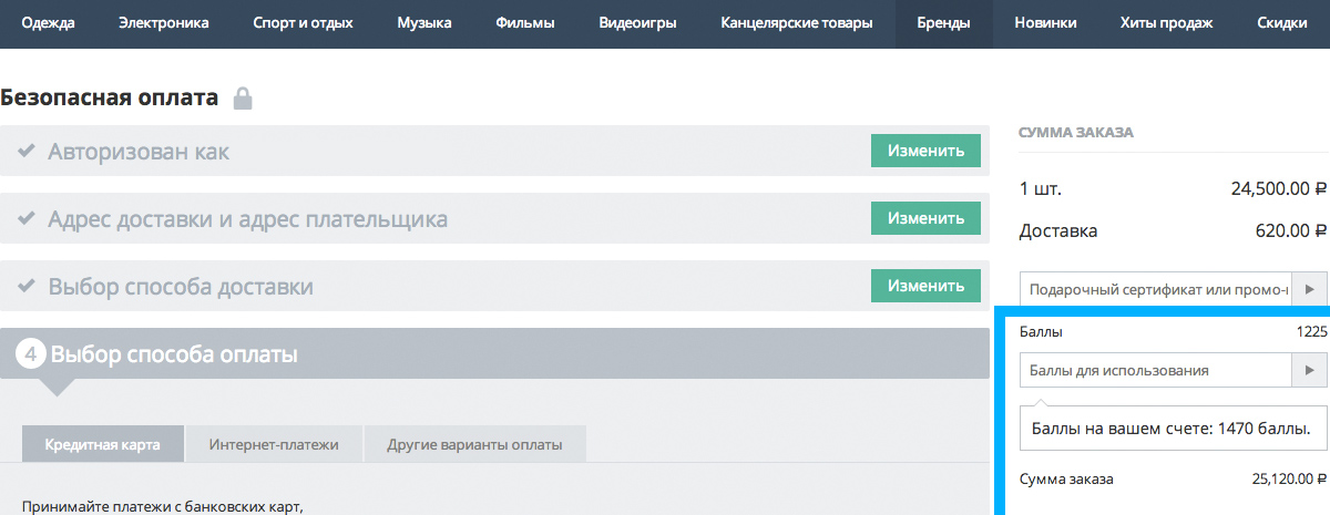 Завершая покупку, вам необходимо ввести имеющиеся у вас бонусные баллы в полe "Бонусные баллы", и стоимость вашей покупки будет автоматически пересчитана.